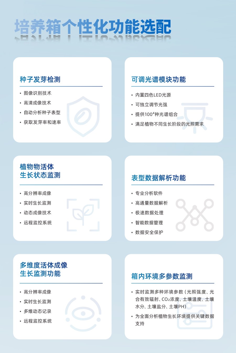 18、动态成像:系统支持对专用影像装置进行设置,可在箱体内自动获取种子发芽、苗期、全生育期的影像图,并可结合AI人工智能算法对影像图进行智能合成与分析,形成植物的生长动态实物影像。