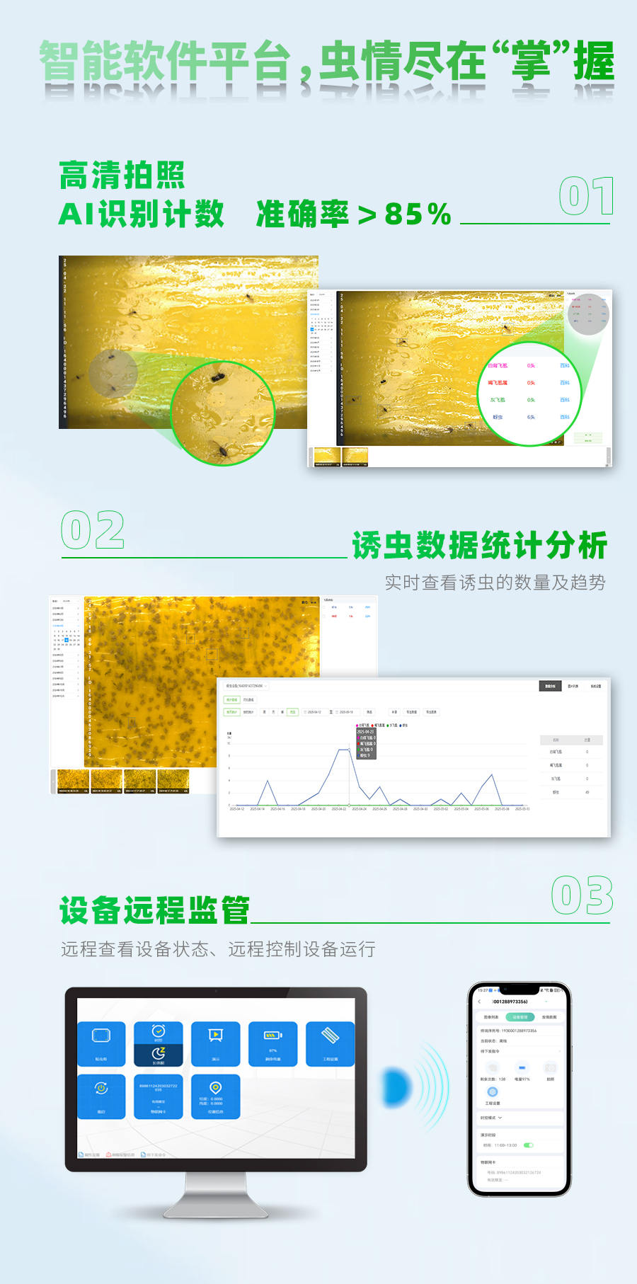 3. 智能识别、自动计数:内置2000万像素高清工业相机,利用优良的图像识别算法,能够对蚜虫进行精准识别,自动计数。